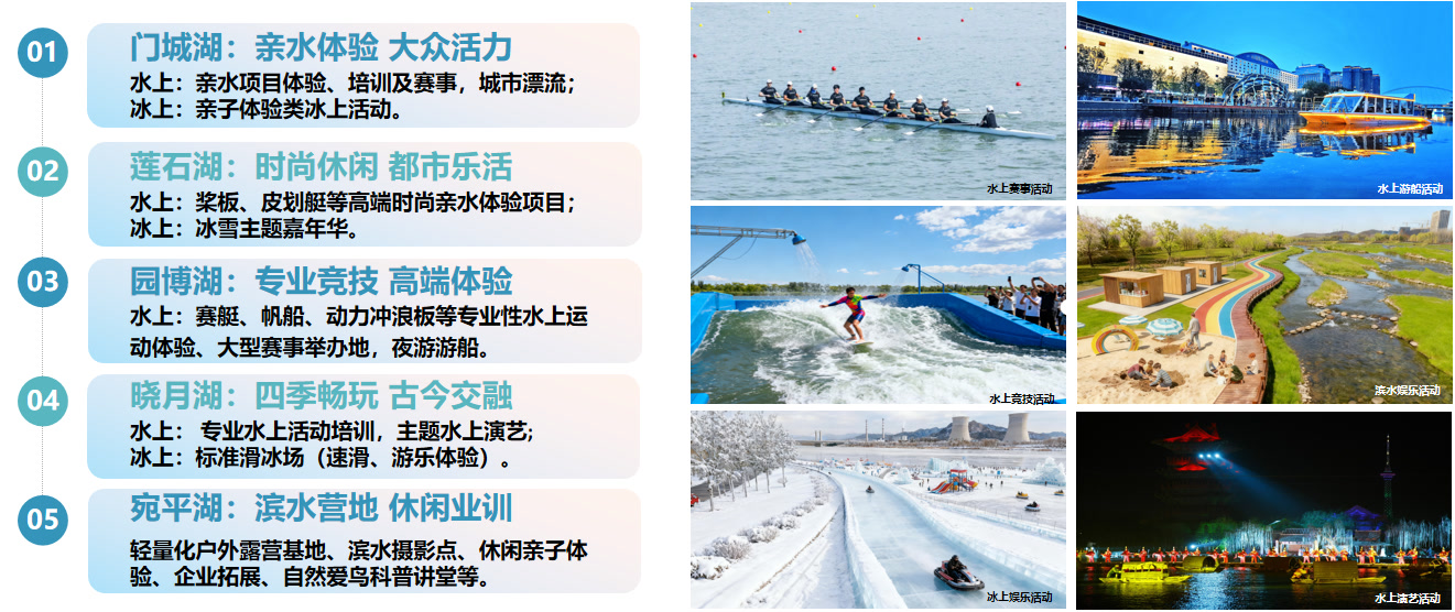 其中,门城湖设计亲水体验项目、培训及赛事,莲石湖设计了桨板、皮划艇等高端时尚亲水体验项目,园博湖设计赛艇、帆船、动力冲浪板等专业性水上运动,晓月湖设计专业水上活动培训、主题水上演艺,宛平湖则是设计轻量化户外露营基地、滨水摄影点、自然爱鸟科普讲堂等。
